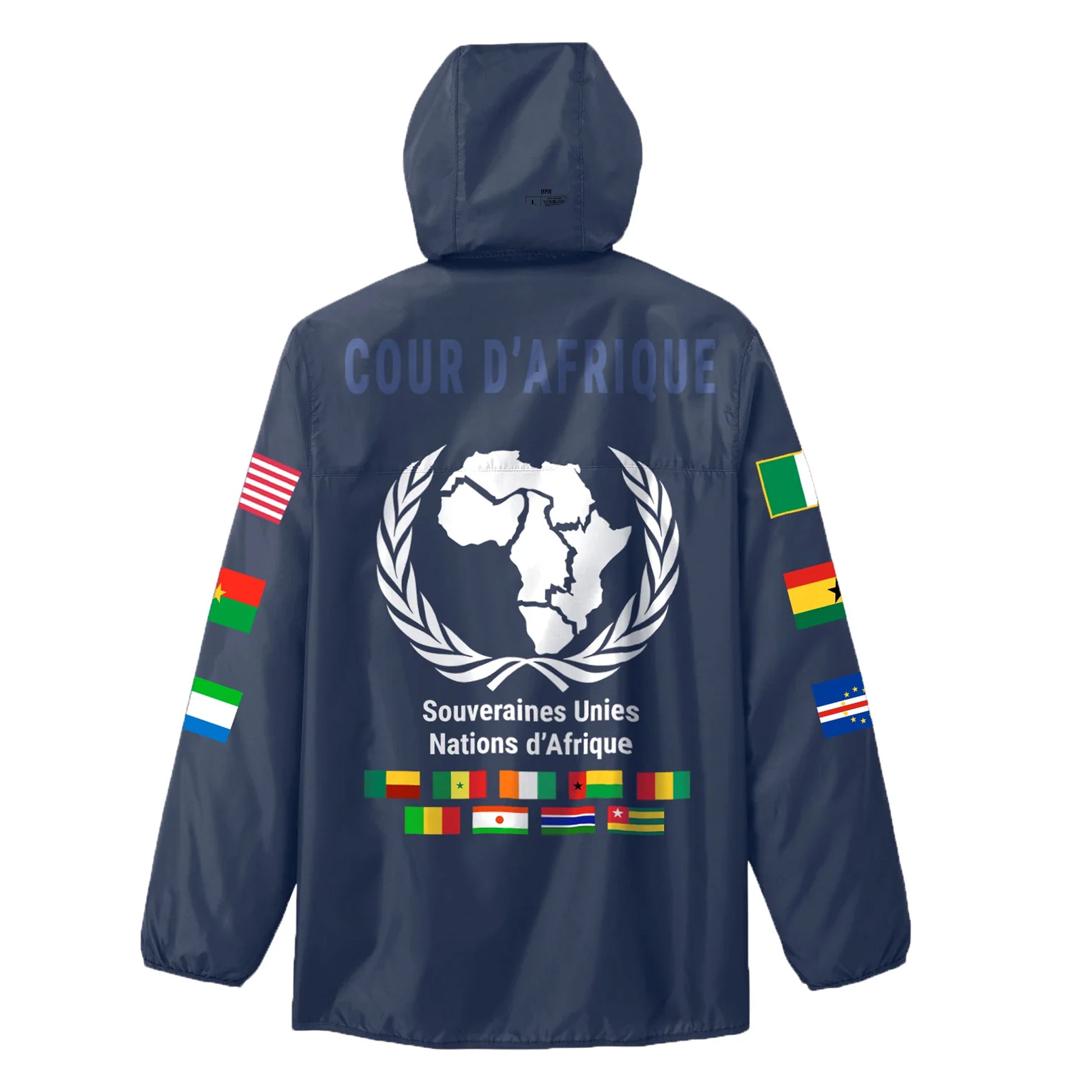 AFRICAN S.U.N. WINDBREAKER is made from 100% lightweight polyester and features an all-over print of the African S.U.N. graphic and the flags of ECOWAS member nations.